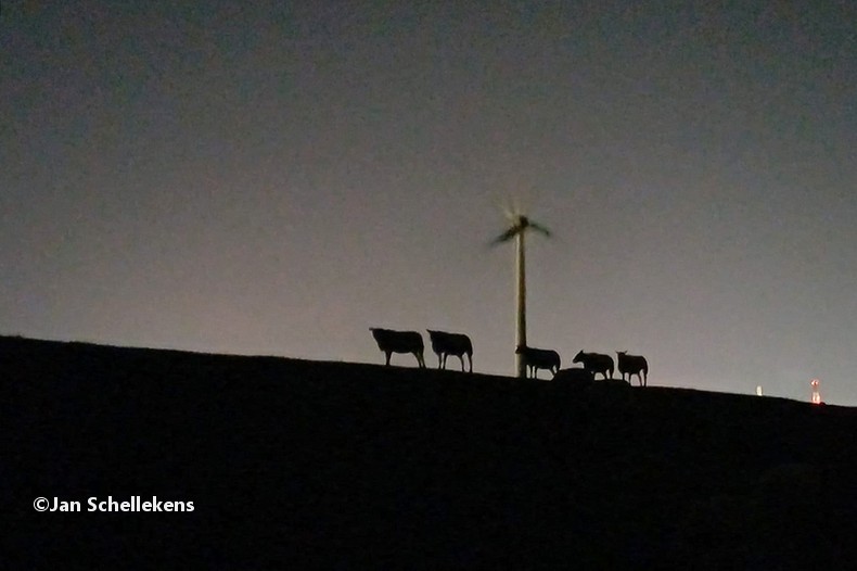 The first 10 kilometers are crossing Europoort, one of the biggest industrial sites of Europe. Much chemical industry (like oil refinaries) are located here, operating day and night, lighting the sky with lights, flames and smoke. Not the nicest part of the E8, but passing this at night brings fascinating views. At 00:00 midnight my 60th birthday starts. I am walking directly next to the A15 highway (almost deserted), and directly under huge windturbines. When I look up I see the fast rotating blades coming directly towards me, again a unique experience on the E8.