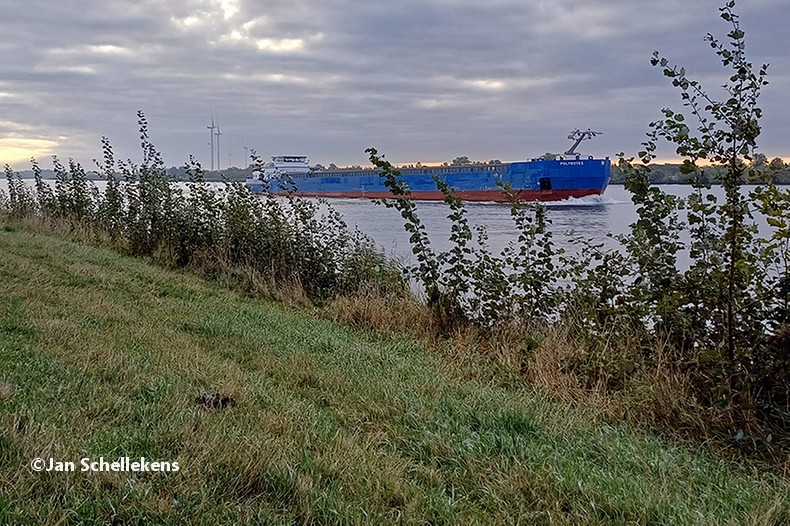 When I pass the Rotterdam suburbs of Hoogvliet there a few street benches along the river and I lay down for some 10 minutes to have a power nap. Walking during the nightly hours is not very difficult, although I get tired, inevitably. Obviously, I am not 59 anymore. After dawn the views are typical Dutch river landscape-ish: wide scenery and big tankers passing every couple of minutes.