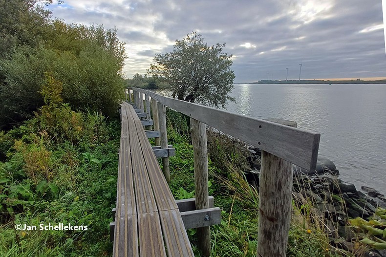 At approx. 34 kilometer the Johannapolder is being crossed, which is special for hikers. The soil of the river bank is at the same level as the average water level of the river. Since I am still relatively close to the North Sea, which has very strong tides, it means that the river bank is under water for parts of the day. Nowadays there are boards for hikers that enable them to keep their feet dry at any tide. I have chosen my starting time of this stage in such a way that I am at the Johannapolder during low tide.