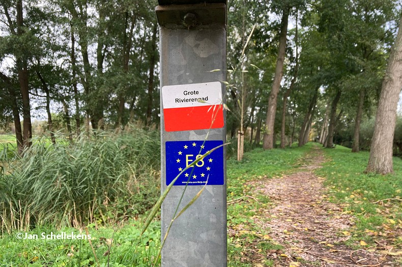 The local name of the Dutch E8 is the Big River Trail; it leads from west to east across the country along several big rivers upstream. After almost two hours hiking I cross the river to the southwest and leave the industrial site behind me. Almost directly the landscape changes dramatically very small and old villages, surrounded by dykes and meadows. I continue in a moderate pace, as I have a long day ahead of me.