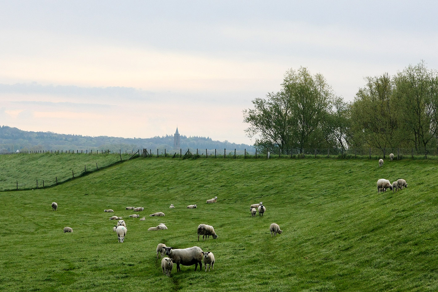 Through the few woods and mainly fields I continue my way eastbound. After 18,5 kilometers I reach a milestone in my E8: the Trail meets the river Rhine for the first time. The Trail will follow and meet the Rhine many times during the next 650 (!) kilometers. The view from here on the Rhine is not spectacular: between the dike and the river there is a wide area of meadows, called the river forelands / uiterwaarden. The last kilometers to the village of Amerongen are very typical for the landscape in this part of the Netherlands: a dike, on one side the water and on the other side the protected land. There are sheep & lambs in the meadows and many cyclists are enjoying a ride on the dike.