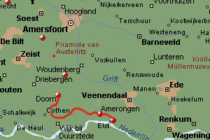 In the villages that I cross, like Langbroek, Darthuizen and Amerongen, it is very busy with people enjoying the sunny Queensday festivities. Back in the woods and fields there is hardly anybody around. After I have left Amerongen I feel an increasing pain in my left kneecap. The pain makes it more difficult to continue to wlak without problems. I had in mind to finish today in the city of Veenendaal, but due to the injury I decide to draw the finishline in the vilage of Elst already, some kilometers earlier.