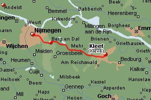 I leave the city of Nijmegen and cross the Long-Distance-Path (LDP) Pieterpad, at the foot of Duivelsberg, or Devilsmountain hill. The Pieterpad is the most popular hiking trail in the Netherlands, crossing the entire country from north to south. At the Devilsmountain there is an official LDP roadsign, with the encouraging note: “Vienna 1803 km”. Some minutes later I have passed the German border, walking along the busy road. Immediately after entering Germany I loose the signs in the field, and the guide does not offer me much support here. Using a detour I get to the village of Kranenburg. The signs in the next part of the stage are a little easier to follow. Just before I arrive in the city of Kleve, I have a nice view over the city from the Sternberg hill. Due to the decreasing outside temperatures I decide to finish today in Kleve, and not to continue to the village of Kalkar, which I had in mind originally. There is no fun to be outdoors and walk on a day like this.