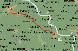 Today is a terrible wintersday; it’s snowing and storming, and it turns out that I am the only person who dares to be out on the streets (even in a city like Kleve!). Unfortunately, the trail leads through a lot of woods today, which makes it even more boring. Of course I meet nobody the whole day. I don’t even see anybody else! Passing the village of Bedburg-Hau (there is an ancient monestary next to the trail) and the village of Kalkar (no remarkable buildings to be seen) I continue my way to the ancient city of Xanten.