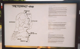 It is a very pleasant day in the springtime. Crossing some mild hillsides (mostly covered by woods, which ruins the views) I walk to the village of Kaldenkirchen. From here the path continous to go south using the famous Pieterpad-Trail. This part of the stage is a little disappointing: on the righthand side there is the valley of the river Maas, but there is no view to be seen due to the high trees. The long straight sandy road is not stimulating either. The finish of my stage is at the café The White Stoan, in my residence (at that time).