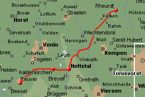 This will be an exciting day for me, as I will be walking home. For over one year now I am residing in the village Reuver, next to the border with Germany. On the border crossing the E8 touches the Netherlands again, as well as the Dutch Pieterpad. In the early morning I walk from home to the railway station of Reuver, take the train to Venlo, take the bus from Venlo to Moers and the next one to Rheurdt, where I left the E8 the previous time.