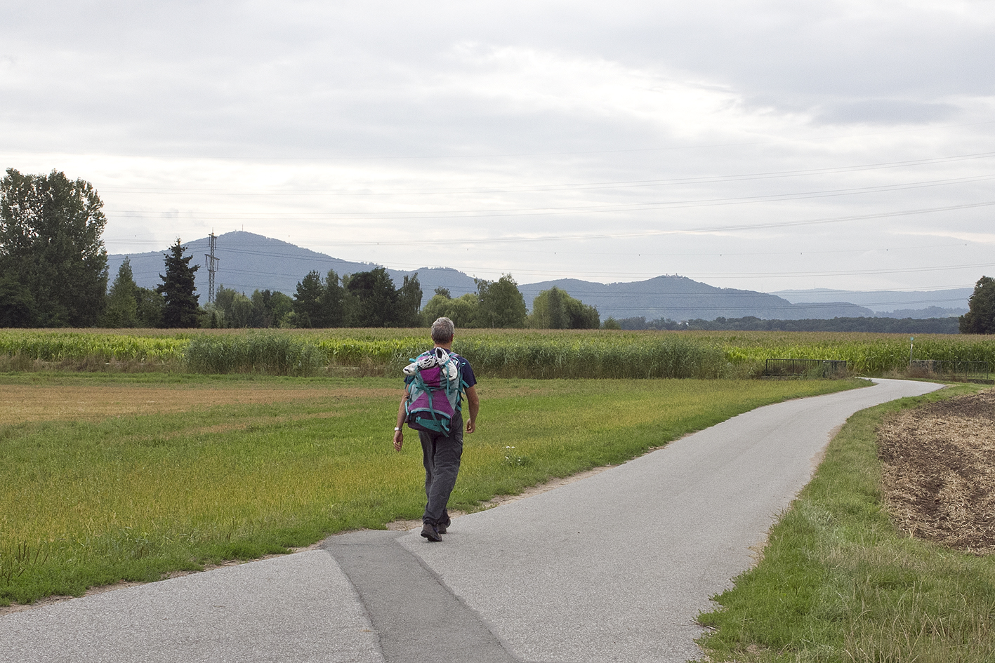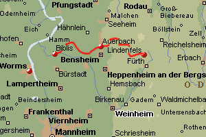 From there the Trail first continous through the Rhein valley (70 meters altitude) to the village of Auerbach. While I walk through the coloured and florishing fields (quiet and open) the first hill of the Odenwald forrest starts appearing in the far distance. It is the Melibocus (514 m altitude), which I will have to climb from the village of Auerbach.