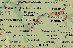 Using a very nice path that stays more or less at the same altitude above the river Main I walk eastbound. The weather is again very hot, and although I walk a big part of the stage in the shade the heat and the dehydration (for some days now) is getting to me more and more. Around noon I have an “I must be dreaming” experience: the Trail leaves some woods and all of a sudden I find myself on a parking lot of a huge Penny-supermarket. After a heavy lunch (with yoghurt and other liquid and cold stuff) I continue my hike. I am very releaved that my foot problems seem to be stabilizing today. Also my legs are not some much hurting as they did yesterday. At the end of the afternoon I arrive in the village of Kreuzwertheim and consequently I cross the bridge to the typical city of Wertheim. It is a very pretty city, located at junction of the river Main and the river Tauber. The weather is, again, beautiful, as it is already for the whole week. The area is very nice and along the Trail it is comfortably crowded with people on bicycles and on foot.