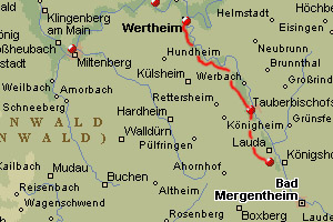 Today I walk my sixth day of my seven-day-hiking-trip. I leave the camp site in Wörth am Main in the early morning. I am carrying all my luggage on my back for the first time in three days and I take the train to Wertheim. Since I feel I will loose a lot of time and energy if I have to carry my enormous backpack all day I decide to take the bus to the village of Tauberbischofsheim which I am supposed to cross later today. I want to leave my luggage there and pick it later today, during the hike. Unfortunately, I can not find any possibility in Tauberbischofsheim to ditch my backpack, so I take the bus back to Wertheim again, still carrying all my belongings.