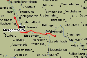 Shortly after I started today, I cross the 983-kilometer-point, which equals 50% of the total distance from Amsterdam to Vienna. I cross through the city of Bad Mergentheim (nice park near the sanatorium in the city centre). I continue to the village of Weikersheim, crossing my last hill for today and this week. My accumulated distance from Amsterdam is now 996 kilometers. After I arrive I find that I have a couple of hours left before I will catch the train back home again. I am in doubt what to do now; the sun is beating on the roads again, but it would be a great achievement if I could finalize this E8-week by reaching the 1000-kilometer point. I leave the backpack in a locker in the railway station of Weikersheim and in the summer heat (25º+) I walk to Quekbronn, where I calculate that the 1000-kilometer-point of my E8 is situated. I take the inevitable picture as proof and I limp back to the railwaystation.