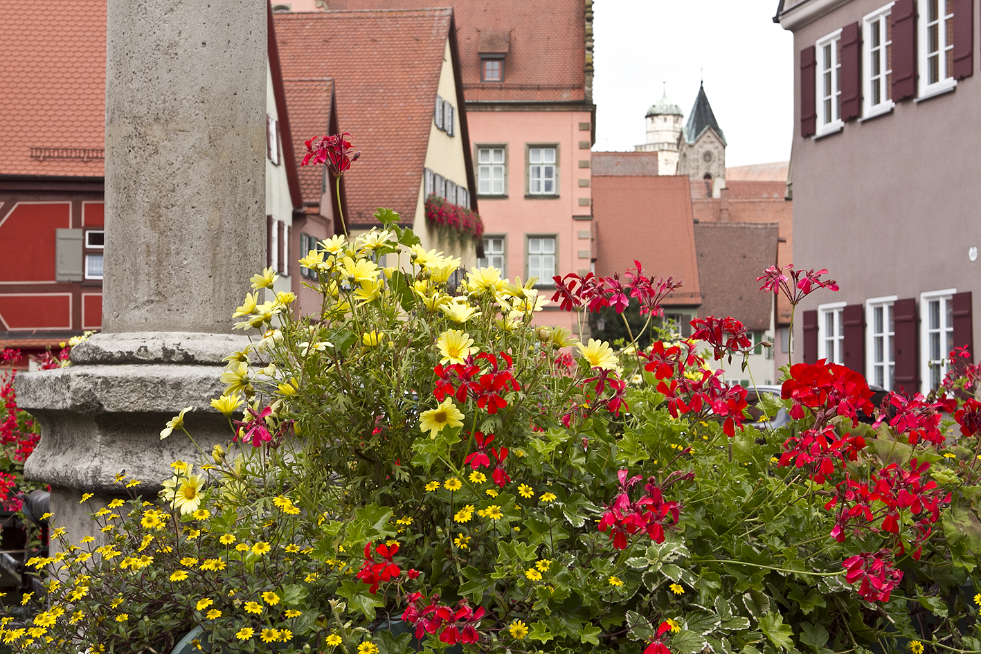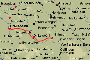 I started my walk at daybreak. The weatherforecast is very good, with lots of sunshine and nice summer temperatures. After one hour of walking I have wet feet due to the high grass in the meadows that the Trail is crossing. This causes me to have blisters later during the day. After a few hours I arrive at the small city of Dinkelsbühl. It is well know for its well kept ancient city centre. The E8 leads straight through the main street, along terraces, shops, fountains and other scenic locations.