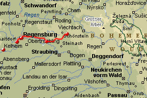 On this gloomy springtime day I do another one of my huge stages. First I walk from the village of Sinzing to the city of Regensburg, crossing the river Donau. The official Trail stops at the outskirts on the westside of Regensburg and it continous at the eastside of the city. According to Gert Trego’s descriptions the missing part can be covered by busses. I choose to walk the entire way (which I also did in the city of Koblenz), which causes me to do an extra 11 kilometers. The missing part includes suburbs, city centre and a huge industrial area on the eastside of the city. After passing the village of Donaustauf I have to cross a huge forrest park (“there are no signs in the park”, Trego says). Indeed, there are no signs at all, which causes me to walk another extra 7,5 kilometers. After this “excitement” the path continous up and down the smooth hills of the Lower Bavarian Forrest, further eastbound. The area looks lovely, just like in a miniature railroad landscape, even without the sun and without fresh awaking nature like today. Finally, after having walked 76 kilometers, I arrive in the village of Stallwang. I am releaved to see that the timetable that I had checked on the internet is the same as in reality.