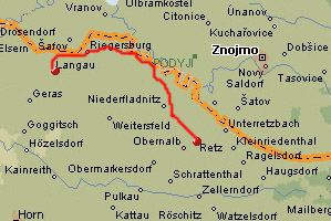 The section that I will be hiking today is supposed to be a very special one. The weather is magnificant; clear blue sky, nice cozy sun and a gentle breeze. In the early hours I pass the small village of Riegersburg and the local castle. On the way to the town of Hardegg, still very close to the Czech border, I am questioned by two customs officers. They want to see my passport and want to know more about my whereabouts. I tell them that I am walking to Hardegg and afterwards to Retz, Mailberg, Ernstbrunn en Langenzersdorf to Vienna, they are amazed. “Will you be doing this all on foot?”, they ask suspiciously. “Oh yes,” I reply, “but not all today!”. In Hardegg I buy myself some bread and beverages at the local bakershop and I enjoy my breakfast in the local park. The view on the castle is very pretty, and behind me the river Thaya flows gently in its role as border river. The path continous along the banks of the river Thaya and crosses a very nice scenic area. The river winds in all directions. After 6 km the path leaves the river Thaya and heads southeast, towards the town of Retz. The forrests alternate with fields and meadows. Just before the town of Retz the path leaves the district Mühlviertel and enters the district Weinviertel (=Winesection). Just before entering the town of Retz I cross, descending a hill named “umbrella mountain”, a couple of vineyards with pretty views to the low country in the south. There’s even a real windmill. It looks more like a Greek than a Dutch one, but nevertheless it is surprising to find such a construction here in Austria.