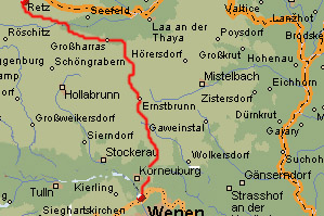 Together with a great weather forecast I get on the train to Austria for a hiking trip, in order to get as far as to the outskirts of Vienna. I start in Retz with climbing the big local tower of the townhall (I did not have the breath when I was here the previous time). The view is very nice, in all directions. After enjoying that I leave for the horizon that I have been looking at in the southeast.