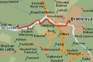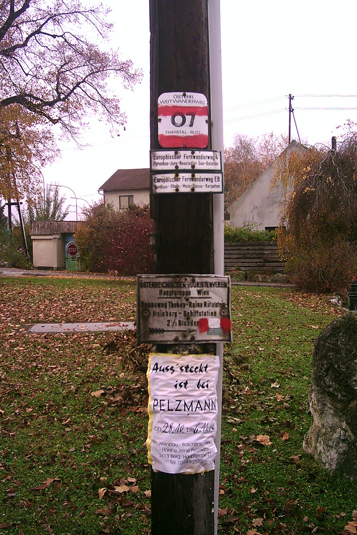 But, first I walk for hours through the fog over the dam, along the river Donau. In Hainburg I cross the river using the (extremely high!) bridge. The part of the stage between Hainburg and Wolfstal is not nice; wet grass, wet leaves, some annoying steep steps and unnecessary d-tours. In the gloomy Wolfstal the E8 and the E4, that have joined the way from Vienna to here, split again. The E4 continues southeast-bound through Hungary and Jugoslavia to Greece. Also in Wolfstal the guidebook of Gert Trego comes to an end.