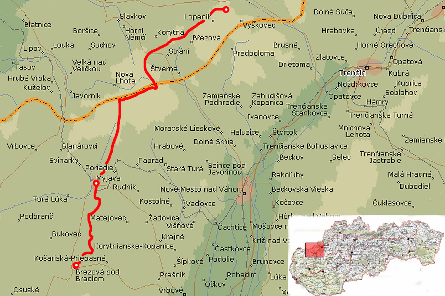 * comment: When the E8 was mapped in 1986 the Trail was crossing one country in this part of Europe: Czechoslovakia. Due to the decision of the people in Czechoslavkia the country was split up in 1993 in two: Czech and Slovakia. It was like that for many centuries before the 20th century. It turned out that of the approximately 700 kilometers between the Austrian border near Vienna, and the south of Poland there were only 46 kilometers in the new Czech Republik, and the other 650 kilometers in Slovakia. Adjustments were made in the E8 to keep the Trail inside Slovakian borders completely. Nowadays the E8 goes from the top of the Velka Javorina to the southeast, back into Slovakia, to the city of Nove Mesto. From there the Trail leads to Trencin.