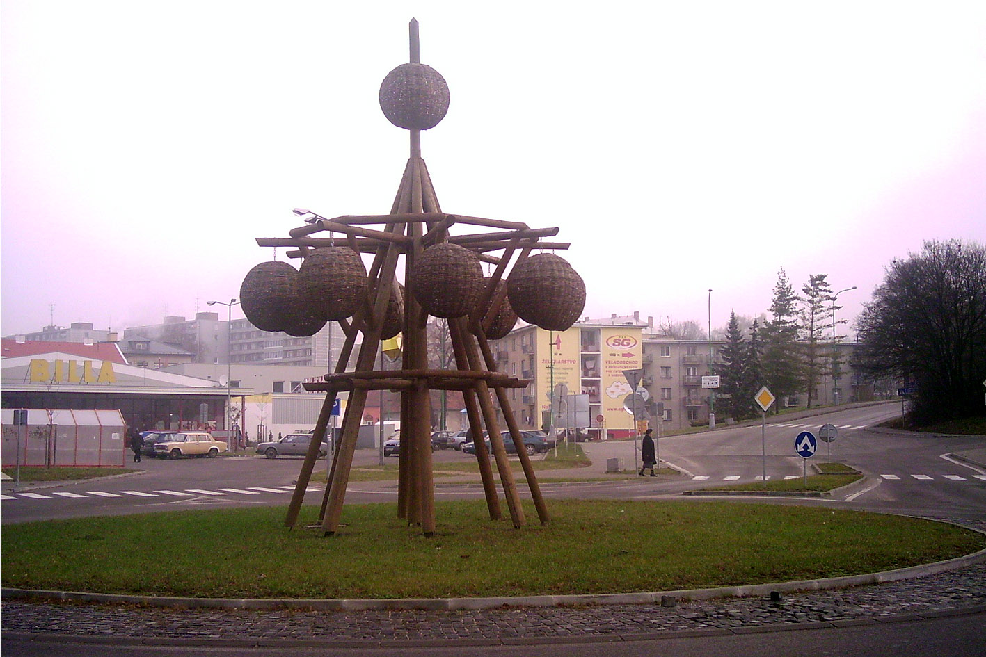 I want to start as early as I can because I have a long day ahead of me. And it’s an exciting one: I will be going to the Czech Republik for the first time in my life! First I cross Brezova in the dark early morning hours. The signs are well placed and with the street lights and my own head light it is simple to follow them through the village. After the village the Trail goes up the hill Bradlo, and crosses a meadow first. The map shows that at some point I must leave the meadow and go to the right into the forrest. This is not clearly marked and I loose some time there taking the wrong path. Once back on the dark track I manage my way through the forrest and up the hill all right. Just below the top of the hill there are some tourist facilities (skilift, snackbar, parking lot). The daylight is starting to show up as I make my way down the hill, going north. My feet are hurting a little bit, due to some blisters, and it gets easier when I pass the village of Polianka, as the Trail follows here the main road. After the village the Trail splits into a country road. On the map I can see that both the main road and the country road are heading for the city of Myjava. The concrete of the main road will be easier for my feet, but I decide to be strict and follow the signs onto the country road. Two kilometers further the road enters into Myjava, near a gasstation. I buy some refreshments and some chocolate bars. It is Sunday morning and I do not expect to come along another point of sale today. Myjava is more modern than I expected, there are even western supermarkets. There even opened on Sunday!