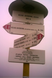 Leaving Myjava the Trail goes up the hill. Once out of the city the last descent for the final climb is done, and then the Trail is heading straight north, to the top of the Velka Javorina hill, to Czech. The weather is very nice. The sun is shining, and there’s no wind. The climb up the hill is not exciting, but long. There are a few other people on their way, Sunday tourists. A few kilometers before the top of the Velka Javorina hill the Trail starts following the Czech/Slovakian border. There is a corridor along the border straight through the forrest of approximately 10 meters wide. Every 50 meters or so there are small signpoles that indicate the border between the two countries. Just before arriving on top of the hill I pass a mountain refuge. It is closed for business due to reconstruction. The new owner is working to get the building ready for the winterseason. His father-in-law is helping him out. He turns out to be Austrian, and he tells me he is not confident in his son-in-law’s activities. “Not as much tourists as in Austria, not as much snow in the winter as in Austria”, he tells me. In a few minutes I walk up to the top of the hill. It is covered in fog, of course.