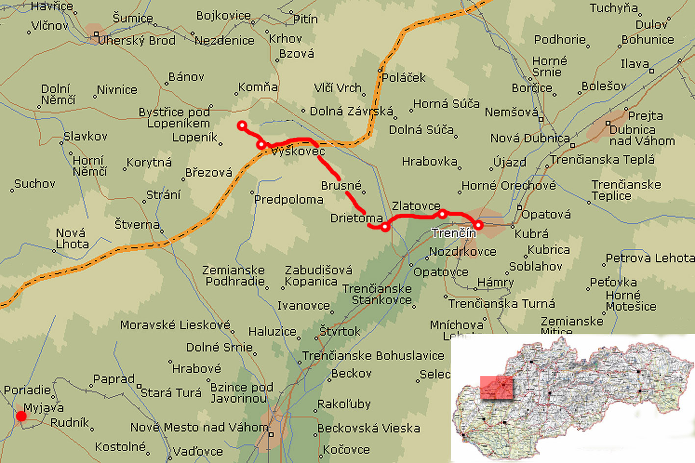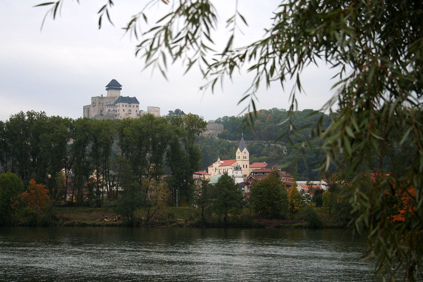 During my walk before breakfast it has started to rain, like it was forecasted. When I continue half an hour later it still rains. The next kilometers from Mikulcin Vrch to the Slovakian border are not exciting; rain, increasing wind up on the hills, limited visibility due to the fog (of course!), and no excitement along the Trail. After a few kilometers of muddy paths the Trail follows again the Czech-Slovakian border. There is no corridor here as the main ridge of the hill is an open meadow. On top of the hill Machnac at 771 meters, the border goes north, and the Trail goes to the southeast, back into Slovakia. There is no view on top of this hill, of course, due to the fog. The next kilometers are probabely nice in the summertime, walking in the forrests and overlooking the fields, but today it is grey, wet and cold. After leaving the forrest I cross the village of Drietoma, and then cross the hill on my way to today’s finish: the city of Trencin. This last hill is kind of difficult as the signs are not clear and I spend some time before I find out that the next signs are situated in the middle of a huge section of farming land. First I need to cross it for 300 meters before I find the sign. After this “excitement” I am heading for Trencin, one of the biggest cities in Slovakia. Its characteristic castle on top of a rocky hill is visible from far away, but in this gloomy weather it is not impressive. The final kilometers of today’s stage are disappointing: I cross a huge section of open land where the construction is done for a new highway, and consequently some kind of industrial area. Finally, after crossing the suburbs of Zlatovce, I cross the river Vah, and I arrive in downtown Trencin. Another milestone in my E8 is achieved. I have the feeling I am really far away from home, now.