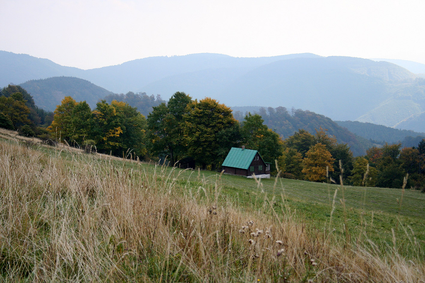 I leave at a decent hour, the sun is already up, and I had a regular breakfast in the inn where I was staying. The weather forecast for today reported dry and cloudless weather. It turns out to be correct. The autumn sun makes long shadows, and it gives a warm glow to the trees that are changing their colours. I leave Cicmany using the road that I had inspected yesterday. Behind the hill Javorinka, that is well visibile from the village, the Trail goes east, following the main ridge of the hills at approx. 900 meters altitude. After two hours I arrive at the Fackovske Sedlo, after a steep decent along the skilifts. The Trail crosses here the regular road, that crosses the hill after some steep climbing. There is a small restaurant, where I get a refresment and give my feet a break. After two days I have already some blisters, and sitting down for some 20 minutes is a big relief. It’s not busy in the restaurant, mainly truck drivers. After the break I continue my way, eastbound. The Trail remains more or less at the same altitude for a while and it is easy to keep a steady pace. After the hill Baran the Trail changes its direction to the south. The sections on the map that are drawn to be forrests are not all that bad; the trees are very low, allowing me to catch some sunlight, or the trees are widely spread.