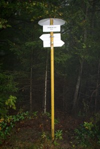 The weather is totally different from yesterday: rain, wind, and of course fog. From the Sedlo I go up the hill past a farm and through the woods up to the Vysehrad hill, which is 250 meters higher than de pass. The visibility is zero and the wind makes it very unpleasant to be up here. I follow the Trail to the south, and later to the southeast. My feet are hurting, the weather is bad, and it’s cold. The Trail is very well hidden between the trees, and it is no big fun to be out here, today. One of the Trail signs that I pass on my way indicates the way, but ignores the hikers as the sign is not readable from the path. I have to leave the path and go between the trees in order to be able read what’s on it.