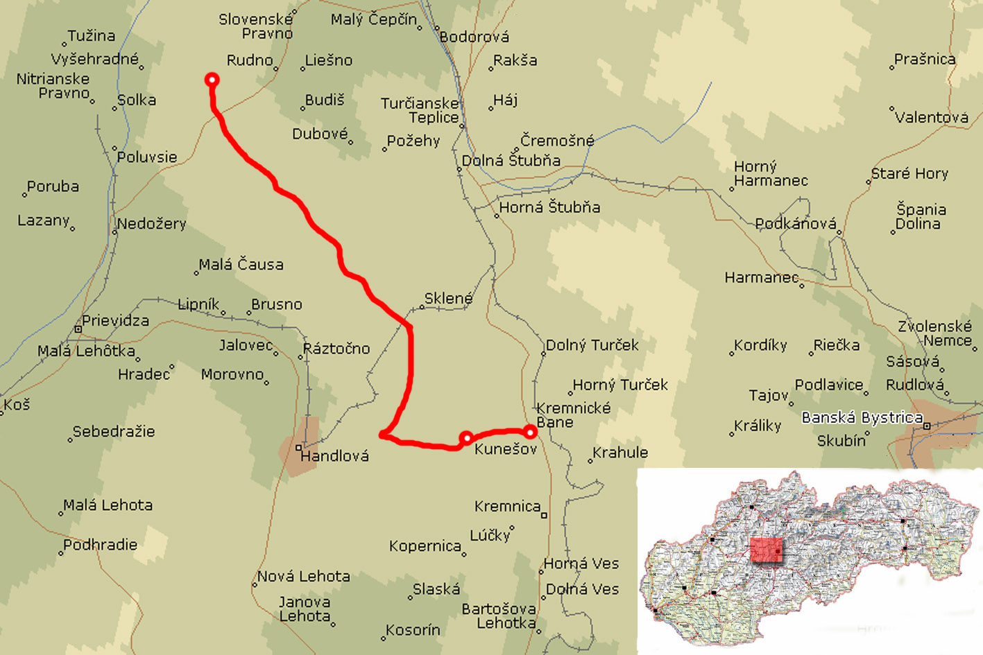 After a few hours I pass the village of Sklene on my left hand side. It’s 12.45pm, I take a lunch break and I consider my options. I am not amusing myself up here, and I could go to Sklene and take a bus back to Turcianske Teplice. The alternative is to stick to the plan: follow the Trail to the village of Kremnicke Bane and take a bus or train from there. I decide to use the few hours of daylight that are left to get as far as possible. Today is my last day of this trip, and it would not be motivating to break off early on your last day and take that as a memory with you for the time (next year?). In addition, Sklene would be not an easy start location for the next trip, as it is hidden in the hills, with only a few buses per day that go there. I decide to continue my way. After climbing the first hill I manage to keep a steady pace, as the Trail is not climbing or descending anymore fopr a few kilometers. At the Sedlo Pod Vysokou the Trail changes its course and goes straight east. After 20 minutes the Trail leaves the forrest and continues in a meadow or field. The visibility in this section is really poor, some 50 meters, and there is nothing to see. It’s a huge plain field that I am crossing. There are no Trail signs visible and by using the map and compass I am able to walk east, without seeing any landmark. After half an hour I cross a fieldroad. It is marked on the map. If the map is really acurately drawn, then some 100 meters north of me there should be a tree. I decide to check this in order to make sure where on the map my current position is. After 2 minutes I see indeed a tree popping up in the fog. And in addition, it has a Trail sign indicating that I was right on the Trail. I continue my way with more confidence than before. After another half an hour I cross a road, and a Trail sign that indicates that I should follow this road to the village of Kunesov. The small village is situated only five minutes further, and I continue along the regular road to Kremnicke Bane. Walking on concrete I am able to increase my pace a little bit, and finally at 4.40pm I arrive in the village of Kremnicke Bane.