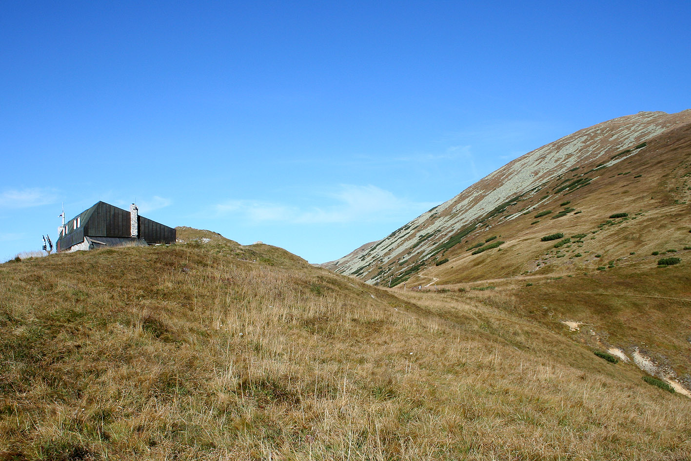 At 8.30am I leave the refuge. The weather is again very nice, lots of sun, not too warm, gentle breeze. Descending is not my favorite activity, so I keep any easy pace, having no need to rush downhill. I pass the Dumbier, the highest peak of the Lower Tatras. It is an extra hour to climb this peak as well, which is not worth it to me. The view from the Chopok yesterday was superb, matching the Dumbier’s. In addition I have to catch a bus at the Certovica pass, and I don’t want to rush, so I continue my way down. South of the Dumbier I pass the refuge Chata Generala Stefanicka.