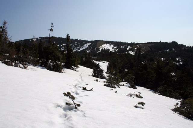 I leave the pension at Certovica at 4.30am, approximately half an hour before sunrise. In the twilight I make a mistake in following the right way, and I end up losing half an hour before I find out and get back on the Trail. By then, I have already wet shoes due to the tranches of snow that I had to cross, even at 1400 meters. Today’s stage will lead me up to 1985 meters. . . . After the peak of the Havrania Pol’ana the Trail follows the top ridge of the Lower Tatra again, well sort of. The ridge itself is completely taken by bushes of 2.5 meters high, that block any view and that do not leave any sign of the Trail. And there is lots of snow of course.