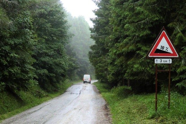 After a few minutes of descending the trees on the right hand side have made way for a meadow, that allows some nice views into the valley and the low hanging clouds. I hear some mooing sounds behind me, like from a cow. My first thought is that it is much too steep here for cows to walk around. I turn around and see some 20 meters behind me a big deer jumping from the uphill side out of the trees on the road. Without stopping it turns its head in my direction and then jumps immediately off the road, downhill onto the meadow. It is being followed within a second by a huge wolf! I am startled and walk to the edge of the road to see if I can see how this piece of natural behaviour ends, but I can’t see any of them anymore. Without any other excitement I pass the small village Uhorna, where I have a break for some mueslibars as a late breakfast. It is raining constantly now but there’s no wind, so as long as I’m moving I’m warm. Following the easy road I pass the suburbs of Smolnik.