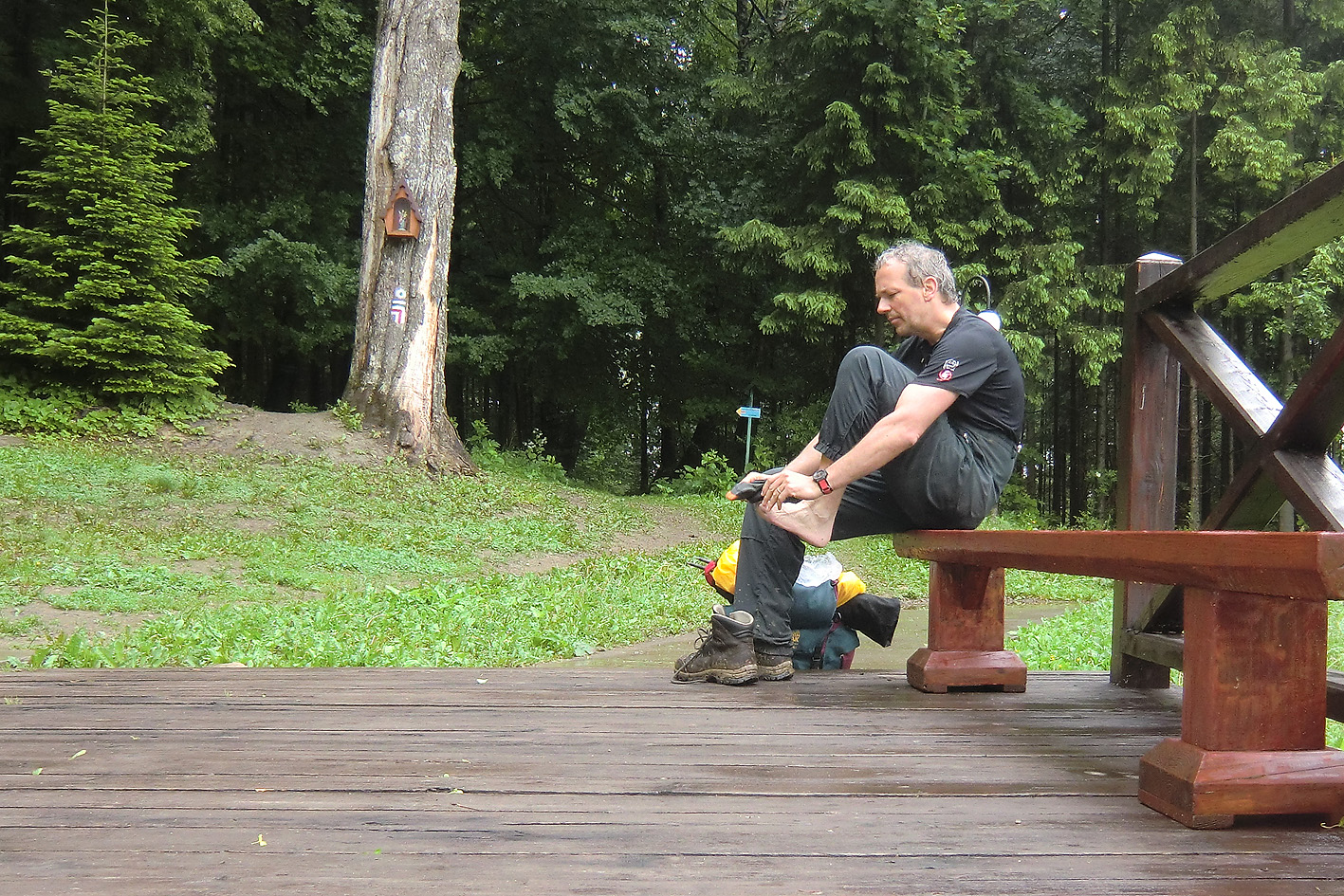 It still drizzles a bit when I walk back to the main road. I go left to Barwinek, and after some searching for a sign I go right (the first road after the bus stop). I follow the green local signs to the small village of Zyndranowa, and I continue my way up the hill. Everything in the woods is soaken wet, including my shoes. It has started to rain again, so the prospects for today are not very promessing. Going up the slope of the Czerwony Horka hill is comfortable, it’s not steep. I continue my way to the next hill, the Ostra, which is getting more steep and slippery. After passing the top the path goes downhill to the small river and follows this to the village of Stasiane. There is small, bare, camping location along the road, but it is completely fludded. No, there are no campers. I continue along the main road, still following the green signs. I pass a regular camping site, where even some tents and caravans are located, before I cross the very busy road between Barwinek and Dukla. On the other side of the road there is a clear sign that indicates the path to continue up the hill. Without too much signs I follow some tracks up the hill, crossing some trees, and some open fields. I end up in the forrest of the Dziurcz hill, and consequently the Czertez hill. On some steep parts of the hills it is extremely slippery and I end up with many mud stains on my raincoat to proove it. The trail up on this ridge is very clear, well maintained and the signs are very good. However, due to the trees and bushes I am not able to look any further ahead than some 50 meters. This makes it a bit tiresome to walk, and my pace goes down automatically. After a long while the signs indicate to go down the hill on the right hand side, which turns out to be a very steep slope, covered with chopped trees and branches. After this section the green signs join the red signs that indicate the E8-Trail again. I follow these to the little church in the woods at Pustelnia sw Jana. I arrive there at 12.10, I have some chcolate bars for lunch and I try to get my socks dry, now that it has stopped raining.