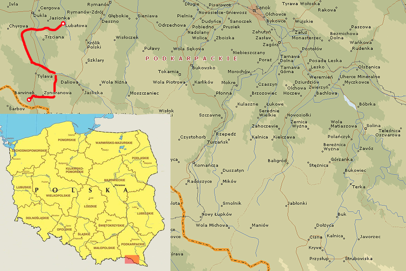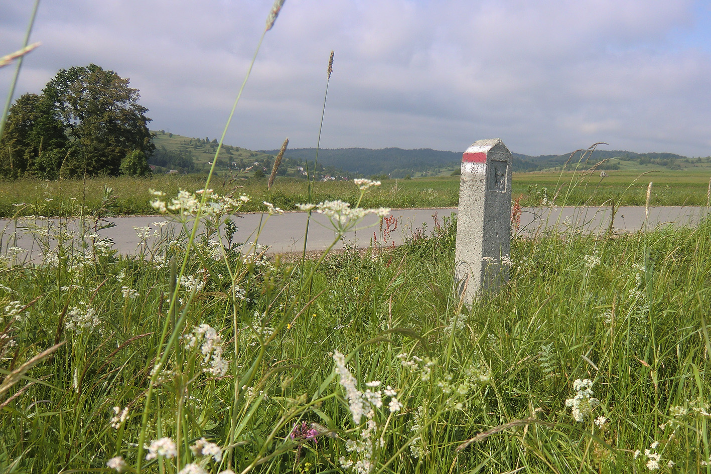 I follow the red signs down the hill, but while crossing an open field I loose sight of them, and I decide to continue down the hill straight on, down to the valley, which is some 150 meters below me. I arrive near the main road between Barwinek and Dukla again, the red signs join me 50 meters later on, and I follow them consequently to the east, up the hill to the top of the Cergowa. The first part of the climb is extremely slippery (almost: risky) due to the rain that has been pooring down during the past few days, and the clay soil on that part of the hill. The rest of the climb is not steep, and it is easy to maintain a steady pace. At the top of the Cergowa hill there is no visibilty due to the surrounding trees and the low hanging clouds. In the next few minutes down the hill the path passes some panoramic points that should give some nice views on bright days. The decent gets steep, still following excellent signs, but due to the forrest soil the path is not slippery. At the foot of the hill, where the soil is drenched with clay again the situation is very different; even the flat sections in the forrest are very slippery, and it is inevitable to get dirty, while walking, slipping, falling, etc. I meet a local guy in the forrest who’s looking for mushrooms and he assures me that I go in the right direction. After leaving the forrest I arrive on the main road, which I follow through the sunny fields, to the village of Lubatowa.